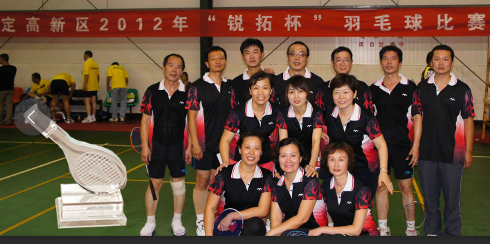 2012年9月14日由高新区工会组织的2012年“锐拓杯”羽毛球比赛在高新区供热公司羽毛球馆举行开幕式,管委会书记孙金博致开幕词。本次比赛共有保定高新区管委会、生力啤酒、中航惠腾、国电联合动力、保百集团、供热公司、天威线材、天威北方、三菱重工、锐拓公司等18家企事业单位参赛,经过两天激烈的角逐,我公司詹景艳、田小义获得了女子双打第一名,公司获得了团体第二名并颁发了奖杯。